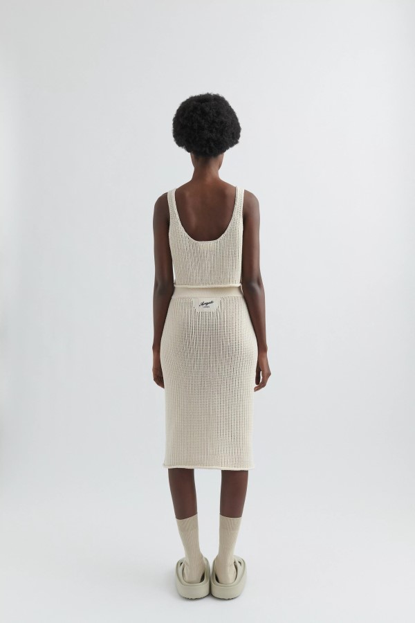 Das Gitter-Tanktop Ist Aus Weicher Baumwolle In Einer Verkürzten Silhouette Gestrickt. Es Ist Mit Schmalen Schulterträgern Gestaltet Und Hat Einen Dezent Gerollten Saum. Kontrastierende ᄀᆴarigatoᄀᆵ-Stickerei Rundet Dieses Stück Ab. Jennifer Ist 176 Cm Groß Und Trägt Größe S.