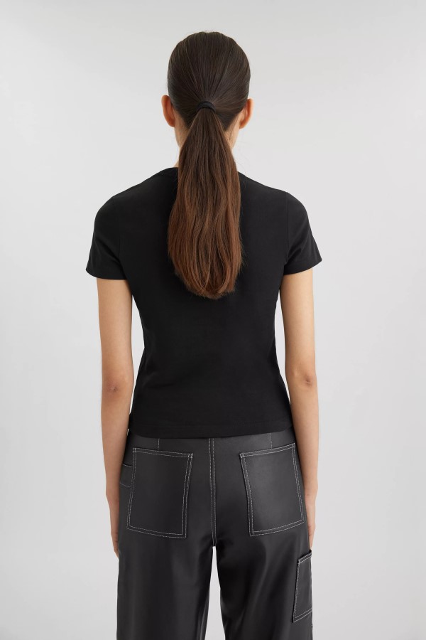 Das Baby-T-Shirt Verleiht Unserem T-Shirt-Sortiment Eine Erhöhte Slim-Fit-Passform. Der Kurze ärmel Ist Unten Vorne Mit Einer Dezenten Farblich Abgestimmten ᄀᄚaᄀᄆ-stickerei Versehen.laura Ist 180 Cm Groß Und Trägt Größe S.