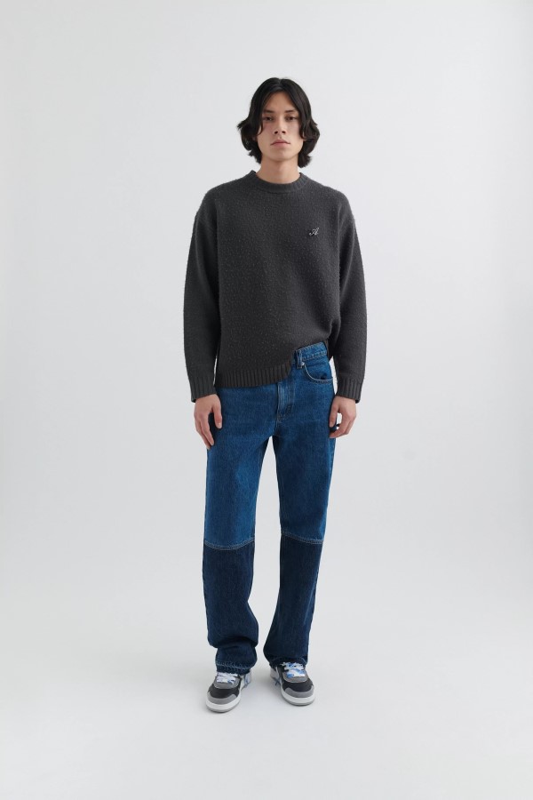 Die Archive-Jeans Bestehen Aus Einsätzen Aus Teilweise Recyceltem Baumwoll-Denim, Die Unterhalb Des Knies Dunkler Werden. Sie Sind In Einer Geraden Beinform Geschnitten Und Verfügen über Einen Gebrandeten Lederaufnäher Auf Der Rückseite. Eduards Ist 191 Cm Groß Und Trägt Konfektionsgröße 31.