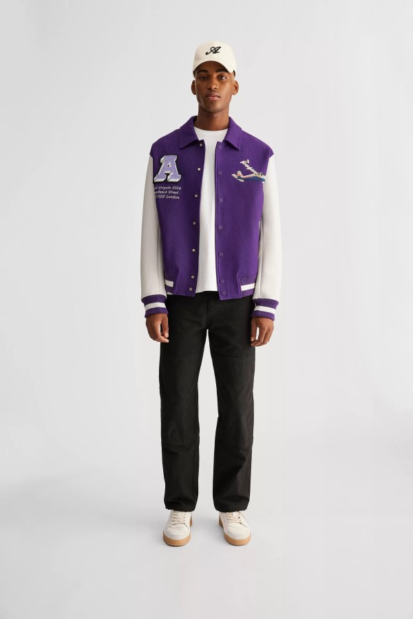 Die Bomberjacke Mayday Ist Von Klassischen Uni-stilen Inspiriert. Aus Wolle In Color-blocking-farben, Mit Aufgesticktem Flugzeug Und Der Adresse Des Arigato-flagschiffs Von Axel Arigato In London. Noah Ist 185 Cm Groß Und Trägt Größe M.
