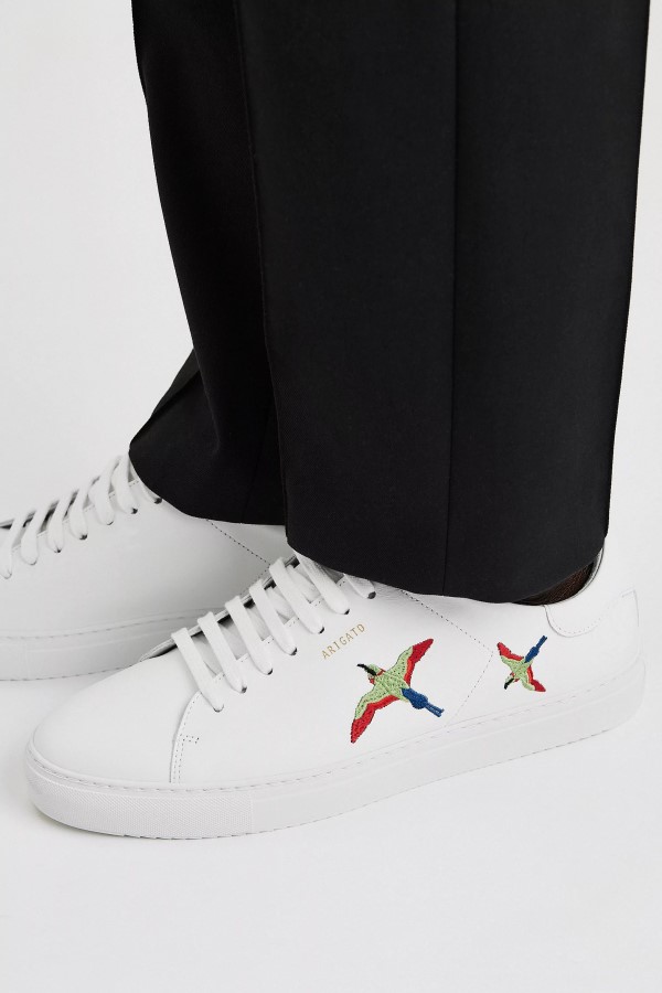 Präsentation Des Sauberen 90er-Bienenvogels Mit Details Der Ikonischen Mehrfarbigen Bienenvogel-Stickerei In Kombination Mit Einem Dezenten Logo Stempel In Gold. Der Handgefertigte Sneaker Bietet Ein Obermaterial Und Futter Aus Italienischem Leder Auf Einer Cup-sohle Mit Einer Mischung Aus Recyceltem Und Neuem Gummi.