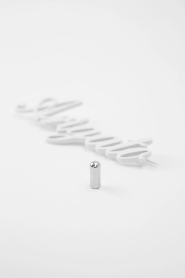 Der Arigato-Stift Ist In Unser Charakteristisches Kursives Logo Geformt. Es Ist Aus Farbig Beschichtetem Metall Und An Einer Schmalen Stange Befestigt, Die An Kleidung Oder Accessoires Befestigt Werden Kann.