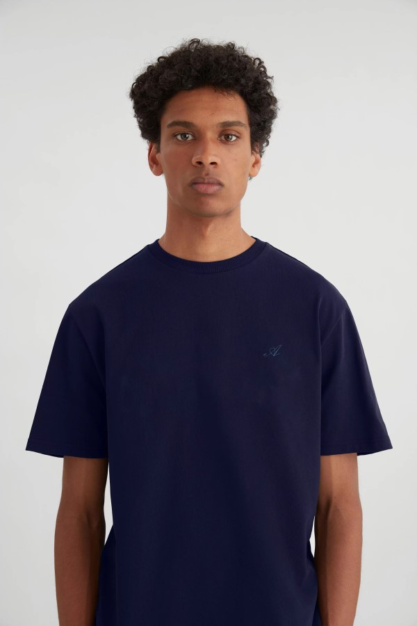 Das Charakteristische T-shirt Mit Rundhalsausschnitt Ist Aus Gots-zertifizierter Bio-baumwolle In Bequemer Normaler Passform Geschnitten. Es Ist Dezent Mit Dem Buchstaben ᄀᆴaᄀᆵ In Farblich Abgestimmten Fäden Bestickt. Vincent Ist 186 Cm Groß Und Trägt Größe M.