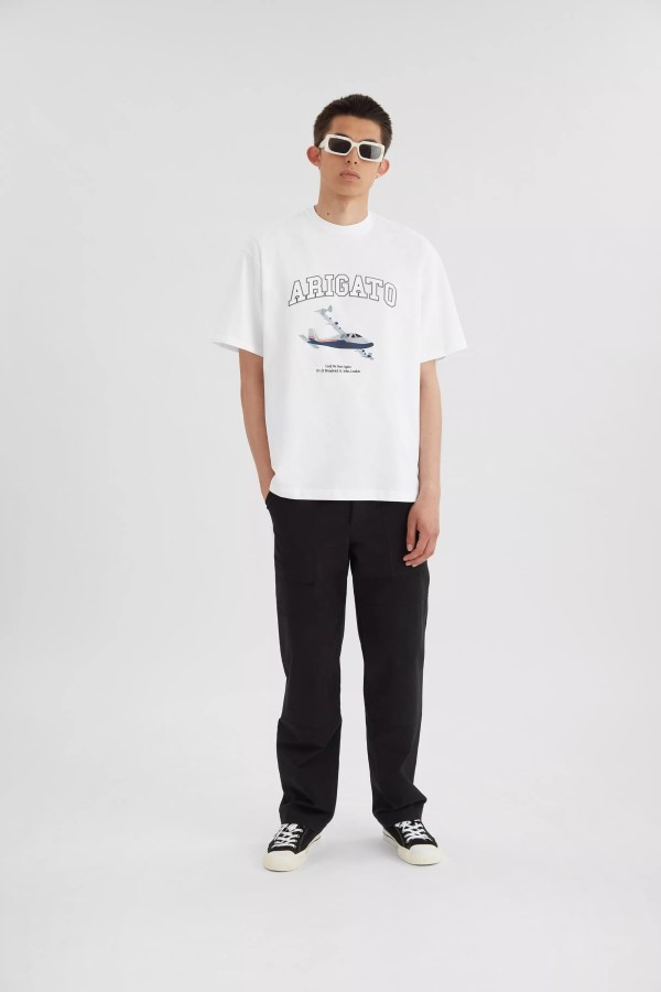 Das Voyage T-shirt Ist Aus Bio-baumwolle In Entspannter Rundhalsform Geschnitten. Es Ist Mit Dem ᄀᆴarigatoᄀᆵ Logo, Einem Flugzeug Und Der Adresse Unseres Londoner Flaggschiffs Bedruckt. Niek Ist 188 Cm Groß Und Trägt Größe M.